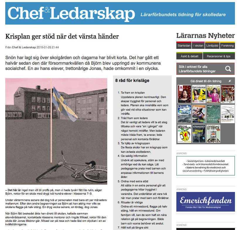 Idag publicerades en artikel i tidningen ”Chef Ledarskap” om krishantering i skola och förskola. Malin har blivit intervjuad om hur man kan arbeta med krishantering i skolans värld och hon delar med sig av några tips om vad man bör tänka på.